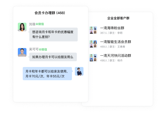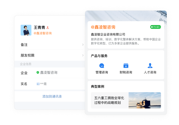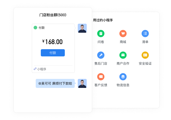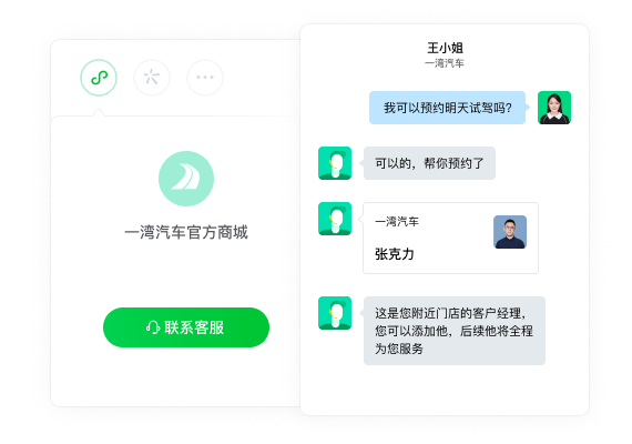添加客戶的微信,在單聊、群聊、朋友圈、視頻號中向客戶提供持續(xù)的服務(wù),還可結(jié)合小程序、支付等能力;更有「微信客服」,為客戶提供臨時咨詢服務(wù)。