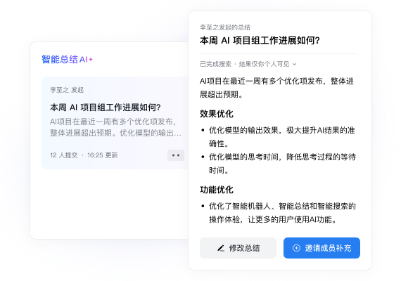 提供智能搜索、智能總結(jié)、智能機器人、智能服務(wù)總結(jié)等豐富的 AI 功能,讓 AI 融入內(nèi)外協(xié)作場景,為辦公和對外服務(wù)提質(zhì)增效。